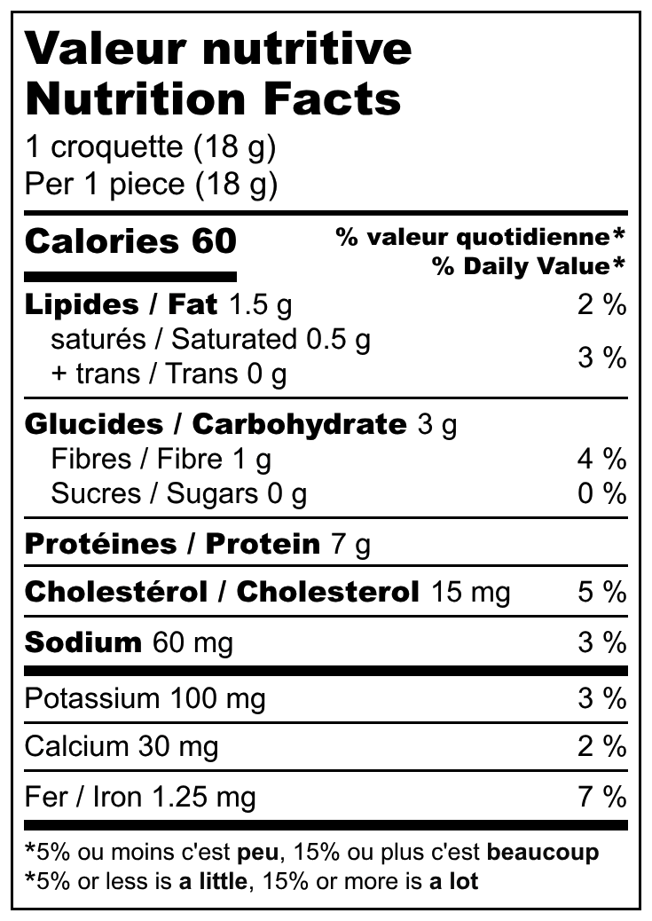 Parmi les préférées des tout-petits, nos délicieuses croquettes sont composées de thon, de fromage feta, haricots blancs, graines de chia, de légumes de saison, puis parfumées avec quelques épices. Enrichies de fer grâce aux céréales pour bébé, elles répondent de belle façon à ses besoins nutritionnels.